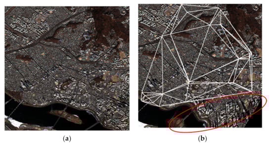The aim of conducting the warping on the real dataset was to confirm the effectiveness of the proposed approach on multi-temporal image pairs captured under different acquisition conditions. The ratio of the first and the second distance for the SURF-matching was the generally recommended value of 0.6 []. Outliers were removed by calculating root mean squares errors (RMSEs) of the CPs relating the estimated affine transformation and eliminating CPs with RMSE values larger than 10. The sensed and reference images of the first real dataset had different spatial resolutions (i.e., 1.2 m and 1.6 m of the reference and sensed images, respectively) according to the acquisition environment, although they were both captured by the Worldview-3 multispectral sensor. Moreover, on the basis of the off-nadir angles (14.9° and 37.9° of the reference and sensed images, respectively) and the azimuth angles (234.3° and 140.9° of the reference and sensed images, respectively) of the images, the built-up areas characterized by tall buildings exhibited different magnitudes and directions of relief displacement. Therefore, general feature-based approaches such as SIFT and SURF could not guarantee the extraction of large numbers of evenly distributed CPs as compared to the simulated dataset constructed from the same image. In this case, the application of a non-linear transformation such as PL and LWM was more likely to incur severe distortions over regions where a sufficient number of CPs were not extracted. By applying the SURF-based matching method with outlier elimination, we extracted 50 CPs by using the real dataset (Figure 5a). As expected, this represented fewer CPs than the simulated dataset. Again, the same parameter values as those used for the simulated dataset warping were set to warp the sensed image to the reference image’s coordinate system. The constructed triangular regions created with the PL and IPL methods overlaid with the sensed image are compared in Figure 6. As we can see from the boundary of the images in Figure 6a) (PL transformation) and 6b (IPL transformation), the IPL transformation could effectively construct the region even along the boundary.