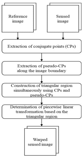 A large number of evenly distributed conjugate points (CPs) over the entire overlapping region of images are required to achieve successful co-registration for the multi-temporal VHR images []. The CPs are then used to construct a non-linear transformation model that can minimize the local distortion between images. The sensed image is warped to the geometric location of the reference image through non-linear transformation models such as thin-plate spline, multiquadric, local weighted mean (LWM), and piecewise linear (PL) used for VHR image warping [,]. Among these, PL transformation is widely used because of its superior performance as compared to the other warping methods [,,].