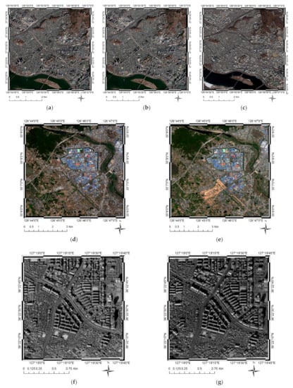 Datasets constructed from Worldview-3 and Kompsat-3A sensor data: (a) Reference image from the simulated and the first real dataset (Worldview-3), (b) sensed image from the simulated dataset (Worldview-3), (c) sensed image from the first real dataset (Worldview-3), (d) reference image from the second real dataset (Worldview-3), (e) sensed image from the second real dataset (Worldview-3), (f) reference image from the third real dataset (Kompsat-3A), and (g) sensed image from the third real dataset (Kompsat-3A).