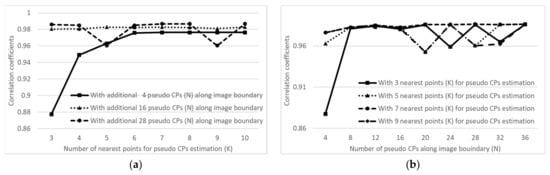 The important parameters for the IPL transformation are the number of additional pseudo-CPs N and the number of closest CPs K used to estimate the location of the pseudo-CPs on the reference image. To find the optimal range of parameter values, we conducted a sensitivity analysis of the two parameters while changing the parameters N and K. This experiment was carried out on a simulated dataset composed of the same reference and sensed images in which geometric distortions were deliberately included. Because the two images should be perfectly identical if all the geometric distortions are removed, the correlation coefficient (CC) values were calculated to check the performance of the IPL transformation according to the parameter values.
