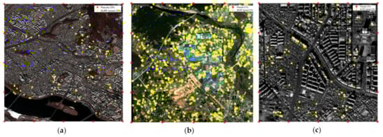 Extraction of conjugate points (CPs) from the real dataset: (a) First (Seoul), (b) second (Gwangju), and (c) third (Daejeon) sites. The yellow circles show speeded-up robust features (SURF)-based CPs, and the red circles show pseudo-CPs.