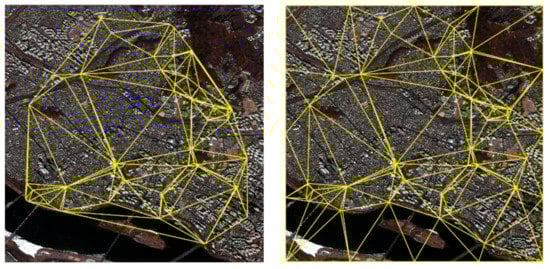In the case of the second real dataset, 1102 CPs were extracted by applying the SURF-based method with the same parameter values (Figure 5b). This large number of CPs as compared to the first dataset was attributed to the fact that the captured seasons of the reference and sensed images of the second dataset were quite similar. The constructed results of the triangular region using the PL and IPL transformations are also displayed in Figure 6a,b, respectively. Because of the sufficient number of extracted CPs, the constructed triangular regions based on both PL and IPL transformations were sufficiently large to cover all the sensed images.