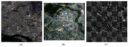 Three sites were constructed for the real dataset by using images acquired from Worldview-3 multispectral (site 1 and site 2) and Kompsat-3A panchromatic (site 3) sensors. The first site was the same location as in the simulated dataset, and the reference image of the first dataset was the same as the simulated dataset. The sensed image (3389 × 3406 pixels) was acquired at a spatial resolution of 1.6 m (different from the reference image) on 5 February 2018. The reference and sensed images for the second site covering built-up areas, mountains, rivers, bare soils, etc., were acquired over Gwangju, South Korea. The reference and sensed images consisting of 5833 × 5330 pixels and a spatial resolution of 1.2 m were acquired on 26 May 2017 and 4 May 2018, respectively. The reference and sensed images for the third site were constructed using Kompsat-3A panchromatic imagery with a spatial resolution of 0.55 m. The site acquired over Daejeon, South Korea, is composed primarily of built-up areas. The reference and sensed images were acquired on 28 October 2015 and 2 January 2019, respectively. The size of both the images was 3000 × 3000 pixels. Note that all the used images were geometrically corrected with a coarse digital elevation model (i.e., processing level 2A for Worldview-3 and 1G for Kompsat-3A), which implied that they had local geometric distortions as well as relative location displacements. The constructed datasets are shown in Figure 3, and their specific information is provided in Table 1.