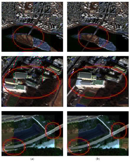 The results of warping by the IPL transformation are presented in Figure 7, in which a portion of blocks from the reference and the warped sensed images are repeatedly attached. To visually emphasize the warping results, the reference image is displayed with a false color composition (i.e., blue, green, and red bands are allocated to the RGB channels, respectively), and the sensed image is displayed with a true color composition (i.e., red, green, and blue bands are allocated to the RGB channels, respectively). As we can see from the boundary of the blocks where lines and objects align correctly, co-registration was reliably conducted by the proposed IPL transformation. For a visual comparison of the warping results by the PL and IPL transformations, some parts of the image boundary are magnified in Figure 8. In the case of the results after warping, severe distortion occurred in some regions after PL transformation (the red circles in Figure 8a), which are not present after the proposed IPL transformation (the red circles in Figure 8b).