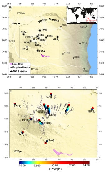 In order to analyze surface displacements due to magma propagation during the crisis, an epoch-by-epoch processing in differential mode was also performed with the TRACK software. The station GITg on the upper edge of the Enclos Fouqué caldera was used as a reference. The result is a time series sampled every 30 s. Because of the limited elevation difference between the stations, we assumed that there were no differences in the atmospheric delay for the area (6 km × 4 km). The automatic tropospheric correction was removed during the processing. Then, to correct sidereal effects, GNSS measurements from the 15 days preceding the crisis were cut into slices spanning 23 h 56 min 4 s (the revolution period for GNSS satellites) and stacked. The average signal resulting from multipath reflections on the antenna was removed from the time series. At last, a principal component analysis (PCA) was also conducted to remove correlated noise between stations. Smoothing was applied using a 30 minutes window filtering. More details can be found in Smittarello et al. [16].