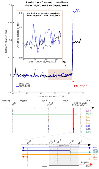 Processing was carried out with the GAMIT/GLOBK software package [43] to determine a daily position for each station. The station REUN, located 17 km away from the volcano was used as a reference to correct for Earth plate motion. Time evolution of two GNSS baselines located at the summit is shown on Figure 2. No significant deformation was recorded during the period spanned by InSAR data prior to and after 25–26 May 2016. Only a very subtle inflation signal (less than 1 cm) can be inferred during the 10 days preceding the eruption (see top part of Figure 2).
