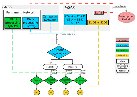 To take advantage of the whole data set acquired during this eruption, we developed a strategy for inversion that consisted of several steps (Figure 4). First, we performed a global inversion that is, an inversion of the cumulated InSAR and GNSS displacements recorded between two dates: one before the eruptive crisis onset, that is, before the onset of the magma propagation and one after the eruption had ended. In this study, we refer to this global inversion as the "static inversion" as it is intended to reproduce the final geometry of the magma that was trapped at depth after the eruption had resumed. Second, we performed a temporal inversion, that is, inversions of the cumulated displacements for 29 time intervals between 20:40 on 25 May and 4:00 on 26 May, from GNSS time series. This temporal inversion was used to track the dynamics of the magma propagation before it reached the surface and the eruption began. The last step was a validation of the methods used for the temporal inversion and of the model family used as an a priori. It compared the misfits and models inverted at a date for which an intermediate InSAR acquisition was available, allowing the displacement of the first part of the eruption to be measured.
