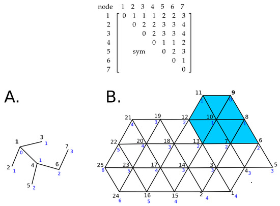 Distances between connected nodes in the graph-method. Node numbers are represented in black. (A) Distances from node 1 are shown in blue; (B) Distance from node 9 are shown in blue and triangles with nodes at a distance of less than two edges from node 9 are colored in cyan.