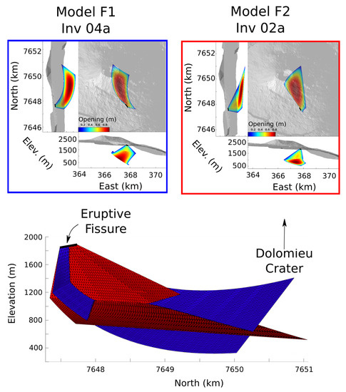 - Fukushima, Y.; Cayol, V.; Durand, P. Finding realistic dike models from interferometric synthetic aperture radar data: The February 2000 eruption at Piton de la Fournaise. J. Geophys. Res. Solid Earth 2005, 110. [Google Scholar] [CrossRef]
