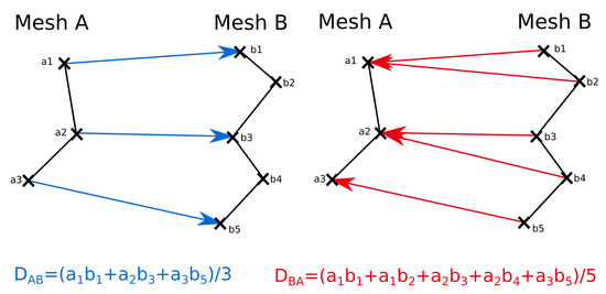 Methods for computing the average distance between two meshes, illustrating why is slightly different from .