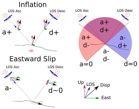 Projection of surface displacement along the LOS for satellite radar acquisition for ascending and descending orbits. The left-hand plots indicate expected displacements in the ascending and descending LOS for an inflation and an eastward flank slip. The right-hand plot shows the expected sign of the LOS projection (considered as positive when directed toward the satellite ) in the ascending and descending orbits for vectors joining a ground point to the circle.