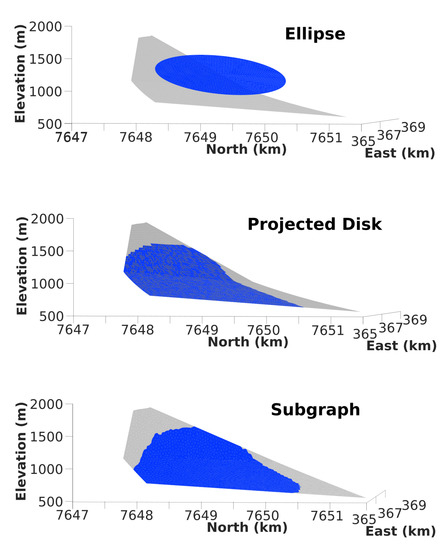 Comparison between the intrusion determined from InSAR data covering the whole eruption (grey) and the best model intrusion geometry (blue) resulting from the temporal inversion of GNSS data at 01:45. Results for the three different methods for inverting the pressure source are shown. (Top) Ellipse; (Middle) Projected Disk and (bottom) Subgraph methods.