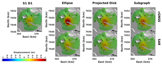 The Ellipse method does not have any a priori on the source location. The inversion of cumulated displacement from GNSS time series data leads to a very good fit (96%) of these data (Table 4). However, the fit on the S1 D1 interferogram falls to 22%. The horizontal location of the deformation source (Figure 9) is comparable to the source determined by the static inversion for the whole eruption. However, the source depth (Figure 9) and pressure (Table 4) are not accurately estimated because of a lack of GNSS stations close to the most deformed area. This leads to an overestimate of the pressure (Table 4) as well as the modeled displacement (Figure 10).
