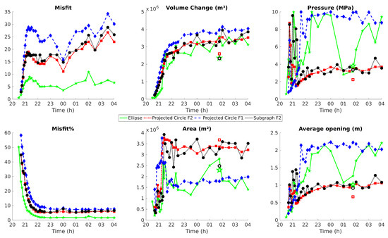 Two best-fit model families (F1 and F2) were determined with the static inversion: F1 characterized by curved sources dipping eastward and F2 characterized by a sill-to-dike geometry. We conducted the inversion of the GNSS time series with the Projected Disk method on geometries characteristic of F1 (inversion 04a) and F2 (inversion 02a). Inversions from F2 give a better fit than those of F1 (Figure 11) for all time steps with a larger difference at the beginning of the time series at 21:00 the misfits for F1 and F2 are 30 and 20, respectively and at 4:00 the misfits for F1 and F2 are 30 and 25, respectively. Pressures and openings determined for F1 are overestimated, reaching 10 MPa, while areas are underestimated, as indicated by the comparison with the result determined from the inversion of the intermediate interferogram (compare the blue curves with the open symbols at 1:45 in Figure 11). On the contrary, inversions of GNSS times series from F2 (Projected circle or Subgraph) show consistent results. Time series inversions also confirm that the Ellipse method leads to unreliable results in terms of pressure, area and average openings.