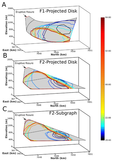 Location of the overpressure source determined from the temporal inversion (colors) for 14 time steps out of the 29 time steps inverted between 20:40 on 25 May and 04:00 the next day. The pressurized area is assumed to be a circular disk projected on the a priori mesh (in gray) of family F1 (A) and family F2; (B) or a subgraph of the a priori mesh of family F2; (C). Source geometries for F1 and F2 are non unique solutions determined from the inversion of the four sets of InSAR data that cover the whole eruption.