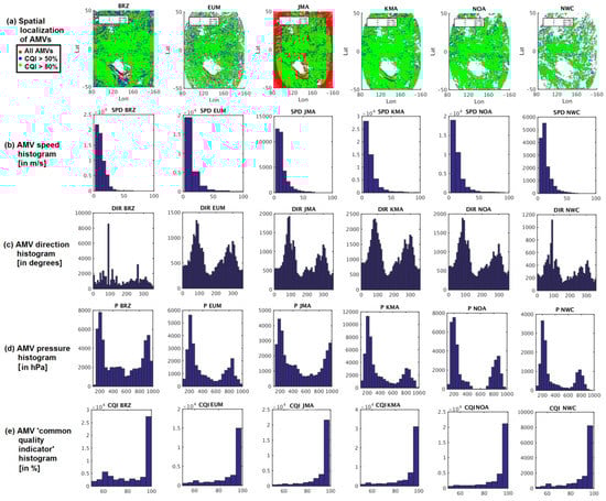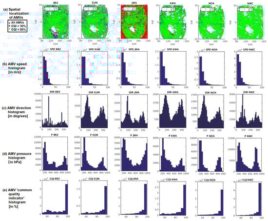 Spatial localization of Atmospheric Motion Vectors (AMVs) (a), and histograms of parameters: (b) AMV speed in m s−1, (c) AMV direction in degrees, (d) AMV pressure in hPa, (e) AMV CQI (Common Quality Indicator) in %, for the AMV datasets in Experiment 1 with CQI >= 50%. From left to right, BRZ, EUM, JMA, KMA, NOA, NWC. BRZ: Brazil Center for Weather Prediction and Climate Studies (CPTEC/INPE); EUM: European Organization for the Exploitation of Meteorological Satellites (EUMETSAT); JMA: Japan Meteorological Agency; KMA: Korea Meteorological Administration; NOA: United States National Oceanic and Atmospheric Administration (NOAA); NWC: Satellite Application Facility on Support to Nowcasting (NWCSAF).