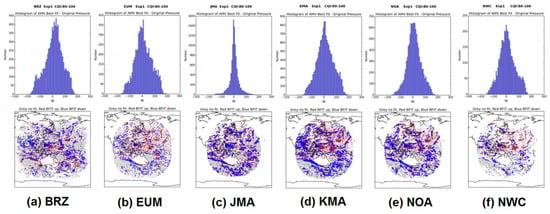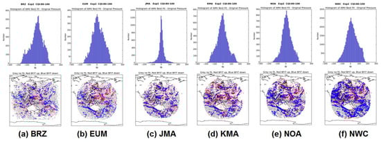 The pressure difference is centered again near zero (upper panels in Figure 9), extending up to ±200 hPa, except for JMA for which the deviation is up to ±100 hPa only. This way, it is again clearer that JMA AMVs are much closer to the AMV best-fit level than all other datasets, although with a possibly stronger dependency on the NWP model background. The maps in the lower panels of Figure 9 depict anew the best-fit displacements above (red) and below (blue) the AMV level for each AMV. Again, they tend to be in similar locations for all centers for collocated AMVs.