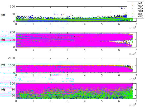 ‘Parameter plot’ for collocated AMVs from the different AMV datasets in Experiment 1, with CQI >= 50% and a collocation distance up to 55 km. Considered variables are speed (a), direction (b), pressure (c), and CQI (d). Color codes correspond to BRZ in green, EUM in blue, JMA in yellow, KMA in red, NOA in black, NWC in magenta.