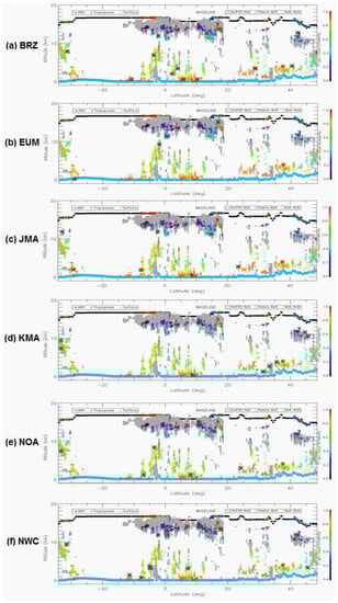Experiment 3: Collocation of AMVs (defined as black asterisks *) with CALIPSO cloud measurements for (a) BRZ, (b) EUM, (c) JMA, (d) KMA, (e) NOA, (f) NWC.