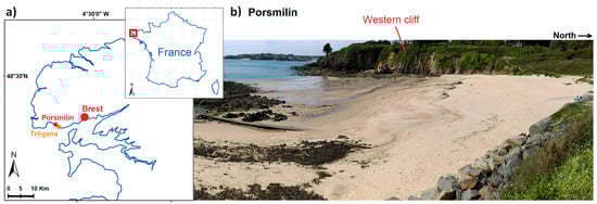 (a) Localization of Porsmilin beach and (b) surrounding cliffs at the entrance of the Bay of Brest in Brittany, France.