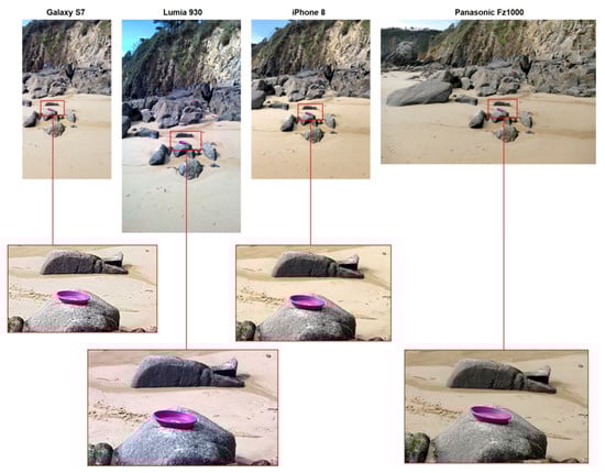 Three models of smartphones were tested to assess if the quality of the topographic reconstruction varies from one model to another or, in a participatory science prospect, if it is possible to combine photographs taken by different smartphones in the reconstruction process. The models used in this study are the Samsung® Galaxy S7, the Nokia® Lumia 930 and the Apple® iPhone 8. Their main properties (given by manufacturers) are summarized in Table 1. In parallel, a Panasonic® FZ1000, a top-end bridge camera (Table 1) is also tested to compare smartphone reconstructions to the results obtained with a more “classical” camera for terrestrial photogrammetry. An example of photographs collected by the different cameras is presented in Figure 2.