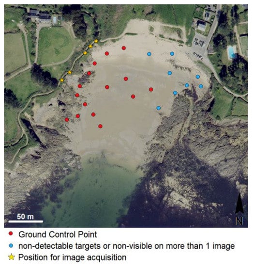 Several positions for photography acquisition were tested for Porsmilin: Including from the top of the western cliff, from the back-beach small dunes, and from the north-east car park. The only set of positions that appears to be compatible with a SfM processing, is the one situated atop the western cliff, as depicted by stars on Figure 5. Using five viewpoints, 34 photographs were collected using the Galaxy S7 smartphone with a fan-shaped capture (linear capture was impossible because of vegetation creating occlusions or precluding access). On the distant parts of the study area, the ground sampling distance and pixel deformation increased due to oblique camera angles, and hence some of the targets distributed on the beach to be used as GCPs were harder to identify. Eight GCPs (out of the 23 installed) could not be detected or were visible on a single photograph, and as a result were not used during processing (Figure 5).