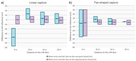 As shown in Figure 7, when the distance from the cliff face increases, the mean error of the raw SfM point cloud decreases for both linear and fan-shaped capturing modes. For linear capturing mode, the mean error varies from −37.9 cm to 2.5 cm and the standard deviation from 38.4 cm to 21.8 cm. Thus, this configuration provides a nearly constant precision (standard deviation of error), but high variations of accuracy (mean error) with varying distances to the cliff face. This problem can be solved by cloud to mesh co-registration, reducing the mean error between 0.2 cm and −1.1 cm. For fan-shaped capturing mode, the mean error of the raw SfM point cloud varies between 7.1 cm and 1.3 cm in absolute value and the standard deviation between 65.4 cm and 0.1 cm. Yet, it has to be noticed that the high accuracy (mean error of −2.5 cm) obtained at 6 m from the cliff is not very relevant because of the low precision obtained (standard deviation of 65.4 cm). The best results are obtained with fan-shaped capturing mode at 20 m from the cliff, with a mean error of 1.3 cm and standard deviation of 0.1 cm.