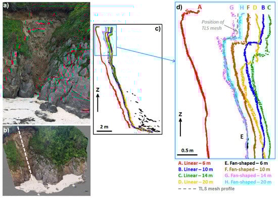 (a) Picture of the cliff face at the moment of the survey. (b) Position of the topographic profile on the SfM dense point cloud. (c,d) Comparison of shape and position of the profiles extracted from the SfM dense point cloud obtained for the different survey protocols.