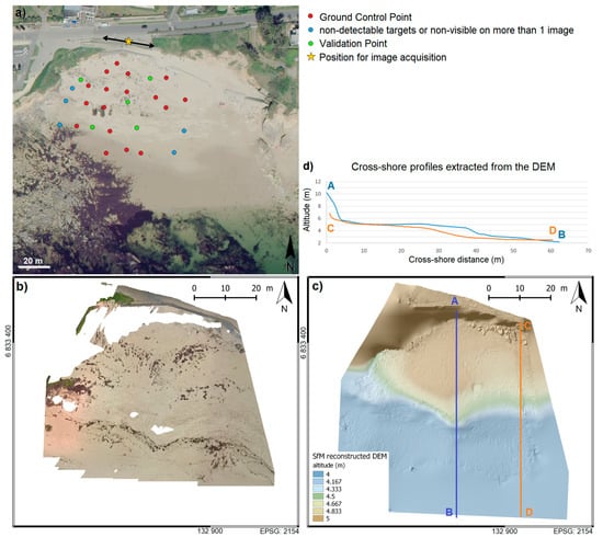 (a) Configuration of the Trégana Beach survey by smartphone SfM photogrammetry, using the Lumia 930 (Background image: BD Ortho—IGN©). Orthophotograph (b) and DEM (c) obtained by SfM processing. (d) Cross-shore profiles extracted from the smartphone photogrammetric DEM.