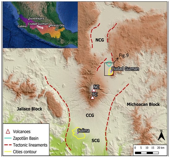 Ciudad Guzmán (1.500 m above sea level), with a population of about 105.000 inhabitants, is a Mexican city belonging to the Zapotlàn El Grande municipality in the Jalisco state. The town is located in the eastern side of a tectonic valley, the so-called Colima Graben []. The Colima Graben is the southern branch of the Colima-Tepic-Chapala triple junction located in the western sector of the Trans-Mexican Volcanic Belt (TMVB). The TMVB is a 1200 km long active continental volcanic arc originated by the subduction of the Cocos and Rivera plates along the Middle American Trench []. The TMVB is structurally divided into several regions, one of which is the Colima Graben (or Colima Rift). The Colima Graben is a structure that consists of three segments, the Northern Colima Graben (NCG), the Central Colima Graben (CCG) and the Southern Colima Graben (SCG). This region is considered the eastern limit of the Jalisco Block. The distinctive tectonic feature of this area is the presence of three structural patterns with NW, SW and EW orientation, associated with the local recent rifting processes [,].