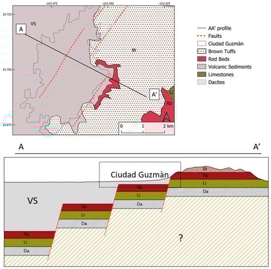 Simplified Geological map of Ciudad Guzman. (VS) Volcanic Sediments; (BT) Brown Tuffs—Plio-Quaternary deposits; (Rb) Red beds—Late Cretaceous; (Li) Limestone; (Da) Dacites—Early Cretaceous. On the bottom, the schematic geological cross-section relative to the AA’ profile in Figure 2a (modified from []).