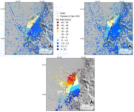 The vertical (Figure 9) and East-West (Figure 10) deformation rate components were calculated combining the ascending and descending S1 data following the well-known relationships [] as follows: