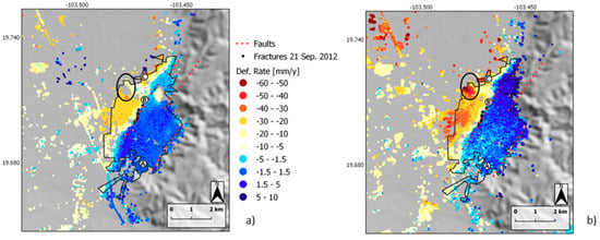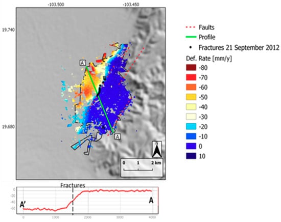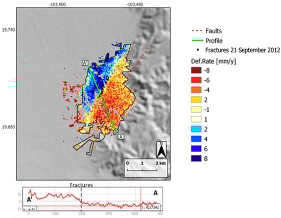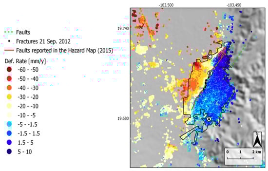 Overlay between S1 velocity map (ascending, values are expressed in [mm/year]) the fault mapped by the 2015 Development Plan (Government of the Municipality of Zapotlan el Grande []). The black lines are the faults traced in the framework of the “development map of the sub-district affected by the fault”.