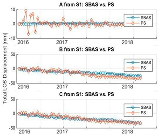 As already mentioned, ground deformation time series of the S1 dataset were evaluated by means of both the SBAS and PS techniques. The obtained LOS (Line of Sight) mean ground velocity maps (Figure 3) highlight the presence of a subsidence (i.e., the distance satellite-target increases) in the NW area of CG, in agreement with the results shown in []. This subsiding area is bordered to the East by the location of the 2012 surface fissures. Crossing the rupture alignment, we found a stable area (South-Eastern side of CG), as observed in [] with ENV and CSK deformation time series (Figure 2). As in [], we considered three sites, (A; B and C, Figure 3) to analyze the ground deformation behavior in different parts of the city. Specifically, point (A) is located in the SE part of GC, where the displacements range from 0 to slightly positive values in the satellite LOS (i.e., distance satellite-target reduced); site (B) is located near the Northern 2012 fissure alignment observed during the field survey of November 2012 [], and site (C) is in the NW part of the city, where the subsidence phenomenon is more pronounced. As it can be noted, even though the two deformation rate maps retrieve the same spatial arrangement in terms of deformation patterns, the values are not equal, especially in the high-rate and less coherent part of the city (i.e., the north-western one) due to the fact that the two techniques are different.