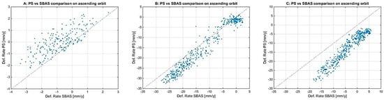 Mean LOS ground velocity of S1 ascending stack: the SBAS vs. PS cross-comparison analysis for the A, B and C selected sites of Figure 4.