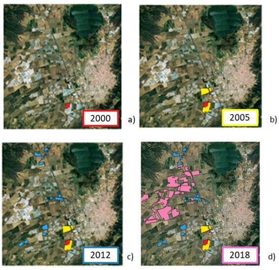 Greenhouse “time-lapse” of evolution in the 2000–2018 period (a–d). Time series of images with the Google Earth Time Slider tool provided by Google Earth Pro (v. 7.1.5.1557).
