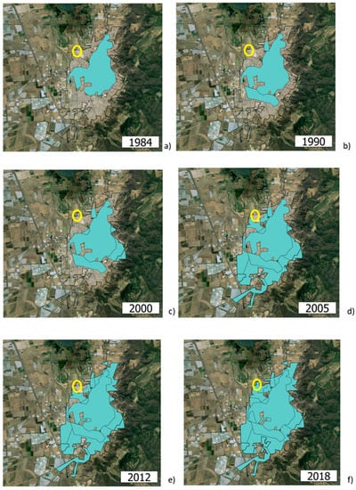 The demographic trend can play, on the other side, an important role in such a context. Actually, we observed an increase in the population in the 1995–2015 period []. As a consequence, the city has been subject to an intense urbanization process in the last few years that has led to a relevant increase in terms of extension. This fact alone cannot justify the subsidence phenomenon since the overall city was subject to the homogeneous urban sprawl, even though it indirectly can reflect on an increase in water resources exploitation. We observed that the urban sprawl is still ongoing, especially in the part of CG that is experiencing the highest rates of deformation (i.e., the black ellipses sketched in Figure 4, as shown in Figure 12 referring to the 2005–2018 time period. It is worth noting that the considered interval comprises the year of the fractures opening (i.e., 2012).