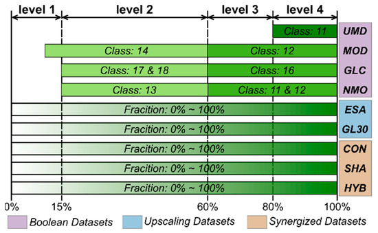 According to the cropland intensity proportional ranges defined in different classification systems, the entire fractional range (0–100%) is divided into 4 levels. That interval of 0–15% is level 1; 16–60% is level 2; 61–80% is level 3; and 81–100% is level 4 (Figure 1). If a cropland class with a wide range contains more than one level, all corresponding level codes should be assigned to it. For example, the cropland proportion for class 12 in the GLC-UMD is 81–100% that is marked with a level code of 4; while the other classes with a cropland proportion less than 80% in this product are labeled with 1, 2, and 3. For GLC-MODIS, class 11 is marked with 3 and 4 according to its proportion ranges from 61% to 100%; and class 14 is marked with 2 while the other classes are marked with 1. For the three synergized fractional datasets, we only need to set the corresponding code for each level after the reclassification process according to the fractionally divided criteria.
