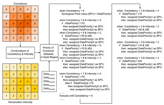 Schematic flowchart of the synergistic cropland pixel assignment based on the analysis of spatial consistency of cropland reclamation intensity. Consistency raster data of the intensity levels (top left) have 7 values, including 9, 8, 7, 6, 5, 4, and 3. The values indicate how many datasets have the same intensity levels. The cropland intensity results (bottom left) is divided into 4 levels: 0–15% is level 1, 16–60% is level 2, 61–80% is level 3, and 81–100% is level 4. Combined with a pre-set data prioritization order, the conditional sentences of the pixel assignment method are shown in the right panel. When the consistency raster value is 9, the synergistic pixel value is assigned with the first priority dataset’s cropland fraction; when the consistency raster value is 8 and the cropland intensity level raster value is 4, if the cropland fraction in the first priority dataset is ≥75% (considering the inevitable defect in the process of forced reclamation rate reclassification, where ±5% tolerance is set), then this cropland fraction is assigned to the synergistic pixel; otherwise, the synergistic pixel value must be the fraction of the second priority dataset. The rest of the combination can be deduced by this assignment principle. When the consistency raster value is only 3, it indicates that a huge discrepancy in cropland intensity existed among these datasets. Therefore, we assign the pixel value for the synergistic cropland dataset by only depending on the cropland fraction of the first priority or second priority datasets. If the fraction in the first priority dataset is within the corresponding intensity levels, then this value is assigned to the synergized pixels; otherwise, the value of the second priority dataset is assigned.