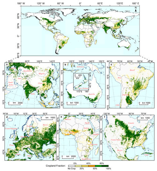 Nearly two-fifth of land surface has been transformed into agricultural land to satisfy basic living needs (e.g., food, timber, and raw textile materials) for human beings so far [1,2,3,4]. As one of the drastic and long-standing land-use types, cropland has possessed nearly 12.2% of the global land area since the Holocene [4]. Besides reshaping the landscape directly, the process of cropland reclamation and land cover change is also an important anthropogenic driving force of global change [5]. Due to the changes in the physical conditions (e.g., radiation forcing, albedo, roughness, and evapotranspiration) of the original land surface [6,7] and the processes of biogeochemical cycles (e.g., the carbon cycle and nitrogen cycle) [8,9,10,11], croplands have profound effects on global and regional terrestrial ecosystems [12,13], water cycles [14], and climate change [15]. Therefore, accurately assessing the impact of croplands on global change highly depends on the reliability of global cropland products [16,17,18]. The reliability of these datasets is mainly reflected in three aspects of the accuracy of spatial distribution, the rationality of reclamation intensity (cropland fraction) per pixel, and the moderate total cropland amount [19,20].