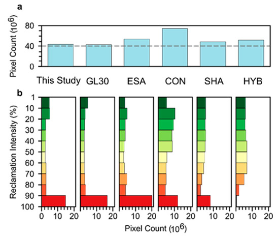 Pixel counts with different reclamation intensities in six fractional datasets. (a) The total numbers of cropland pixels (the cropland fraction per pixel is >1%) for each dataset; (b) the numbers of cropland pixels within every intensity level (the whole 100% interval was divided into 10 equal intervals).