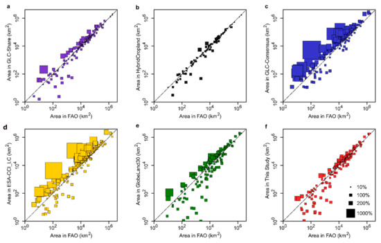 Relative differences in the national cropland areas between six fractional datasets and FAOSTAT data. The x-axis represents the national cropland area in FAOSTAT (2000 C.E.); the y-axis represents the national cropland area in the fractional dataset; the point size indicates the relative difference (|AREAFrac − AREAFAO|)/AREAFAO) in cropland area between the fractional dataset and FAOSTAT dataset, where (a) shows the GLC-Share results, (b) shows the HybridCropland results, (c) shows the GLC-Consensus results, (d) shows the ESA-CCI-LC results, (e) shows the GlobeLand30 results and (f) shows the synergistic cropland dataset results developed in this study.