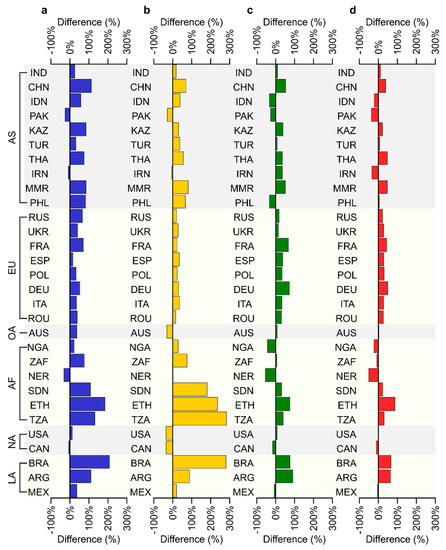 Relative differences in national cropland areas (AREAFrac - AREAFAO)/AREAFAO) in four non-calibrated fractional datasets. The countries in each continent are assorted in descending order according to the FAOSTAT cropland areas. The x-axis represents the relative difference (unit: %); the y-axis shows the country code (named by ISO), where (a) shows the GLC-Consensus results, (b) shows the ESA-CCI-LC results, (c) shows the GlobeLand30 results and (d) shows the synergized cropland dataset developed in this study.