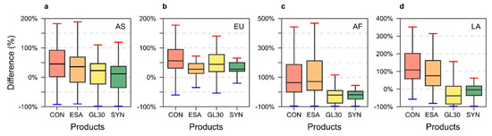 Relative differences in the national cropland areas in the non-calibrated fractional datasets. Where (a) is Asia, (b) is Europe, (c) is Africa, and (d) is Latin America. The calculation included 48 countries in Asia, 47 countries in Europe, 56 countries in Africa, and 43 countries in Latin America. Abnormal points with very large differences were excluded.