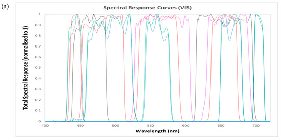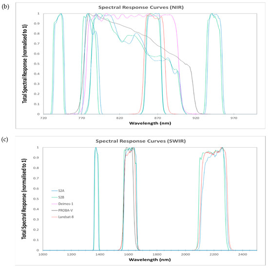 Spectral response curves for all sensors divided into three spectral ranges: (a) VIS (400–720 nm), (b) NIR (720–1000 nm), and (c) SWIR (1000–2500 nm).