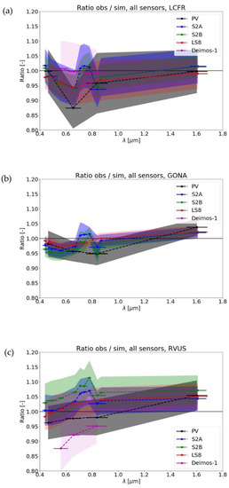 Ratio between the observed and RadCalNet-simulated TOA reflectances as a function of wavelength for PROBA-V (PV), Sentinel-2A (S2A), Sentinel-2B (S2B), Landsat 8 (LS8), and Deimos-1 over La Crau (LCFR) (top panel, (a), Gobabeb (GONA) (middle panel, (b), and Railroad Playa (RVUS) (bottom panel, (c). The shaded areas denote the ±1 standard deviation (σ) of the obtained ratios. Note that no Deimos-1 data were available for GONA.