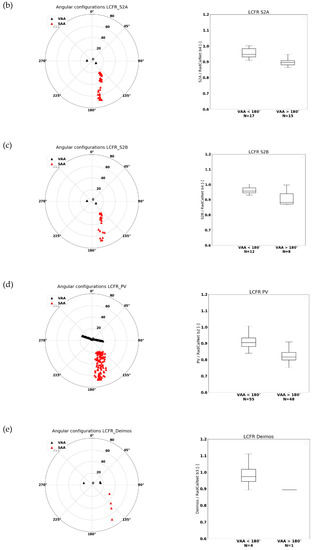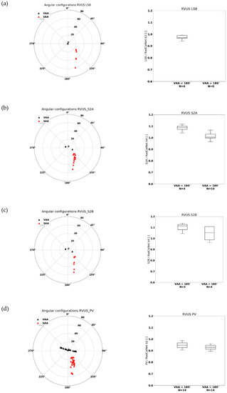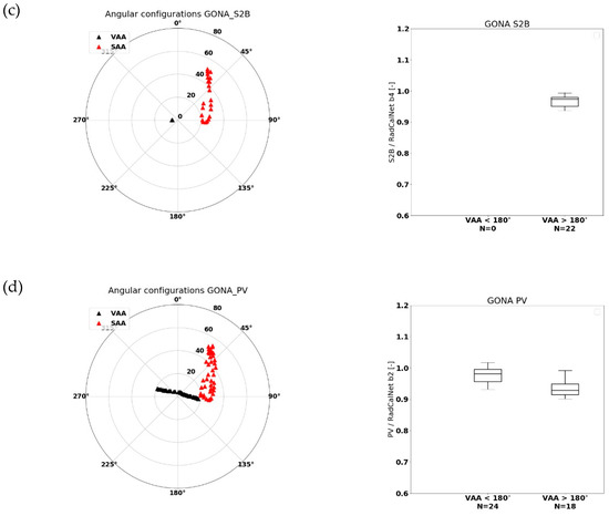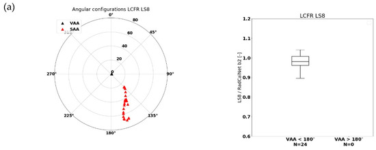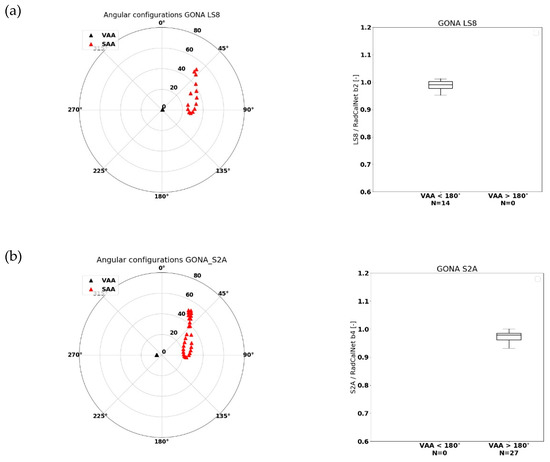 (left) Observation and illumination geometries for LS8 (a), S2A (b), S2B (c), and PROBA-V (d) over GONA. The viewing zenith and viewing azimuth angles (VZA and VAA) are represented by black triangles, while the solar zenith and solar azimuth angles (SZA and SAA) are denoted by red triangles. Zenith angles are plotted along the circle’s radians and increase from the center going outwards. Azimuth angles start at 0° (North), increasing clockwise. (right) Box-whisker plots for the RED channel of the observed/Radcalnet-simulated TOA reflectance ratios over GONA. Results are divided into classes with VAA < 180° and VAA > 180°. The horizontal line represents the median value, whereas the lower and upper box boundaries denote the 25th and 75th percentiles, respectively. Lower and upper whiskers represent the 5th and 95th percentiles, respectively.