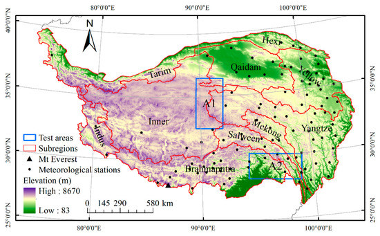 Topographic relief (https://earthexplorer.usgs.gov/), meteorological stations, subregions, and test areas for the parameter determination over the Tibetan Plateau (TP).