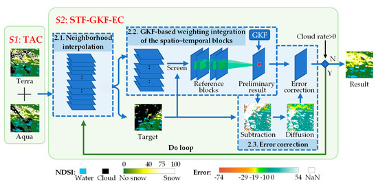 In this study, the clouds of the MODIS NDSI product were removed under a two-stage spatio–temporal fusion framework including the TAC and STF-GKF-EC, as shown in Figure 2.