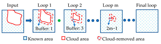 Neighborhood interpolation is a traditional method which has a high precision for filling small areas [22]. In order to ensure the reconstruction accuracy under cloud cover, only the cloud pixels adjacent to the known pixels are filled by the neighborhood interpolation in each cycle of STF-GKF-EC. As can be seen in Figure 3, for the -th loop, the cloud pixels within a buffer no greater than from known pixels, are interpolated by known pixels. Then, after the GKF-based weighting integration and error correction, if the cloud cover rate is larger than zero, the next loop begins to further remove the clouds (see Figure 2).